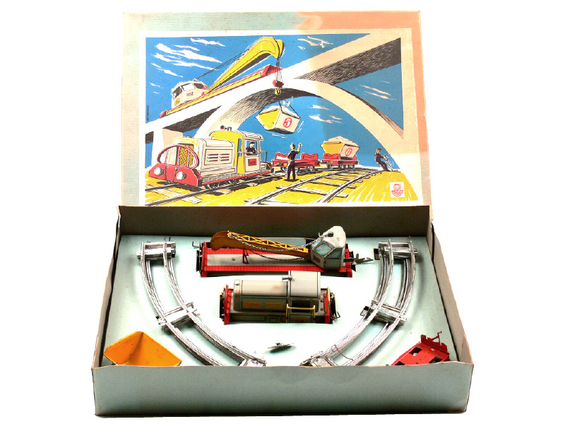 dimensions : 51 x 37 cm - contient : une motrice diesel mécanique (moteur à clef fonctionne), un wagon-grue, un wagon avec benne amovible, 6 rails courbes, une clef & cale de boîte - quelques petites traces d'oxydation superficielles - légère décoloration d'une partie du couvercle de boîte - SUPERBE ENSEMBLE N'AYANT JAMAIS ETE UTILISE !