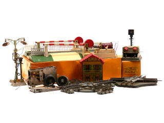 comprend notamment : un transformateur type 6056 U 4, un passage à niveaux électrique (avec boîte), un heurtoir, une boîte de rails de raccordement type RAC-0, 3 lampadaires, un signal de rappel de ralentissement, 4 postes de commande, 2 croisements, des notices & de nombreux signaux électriques à reconstituer - quelques éléments avec boîte - traces d'oxydation & petits manques