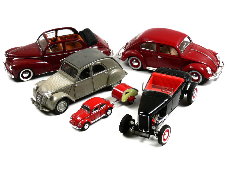 5 véhicules de grandes échelles - états de 'B' à 'E' - miniatures reproduisant les modèles : CITROEN, FORD, PEUGEOT, VOLKSWAGEN & MERCEDES - on y retrouve les marques : ERTL, MAISTO, MATCHBOX, SCHUCO, BBURAGO & SOLIDO - avec manques