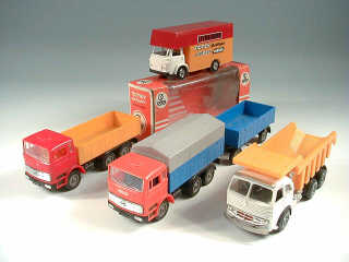 NOREV (FRANCE) 125 MERCEDES LP 2223 Plateau à ridelles avec remorque bleu & orange, bâche grise