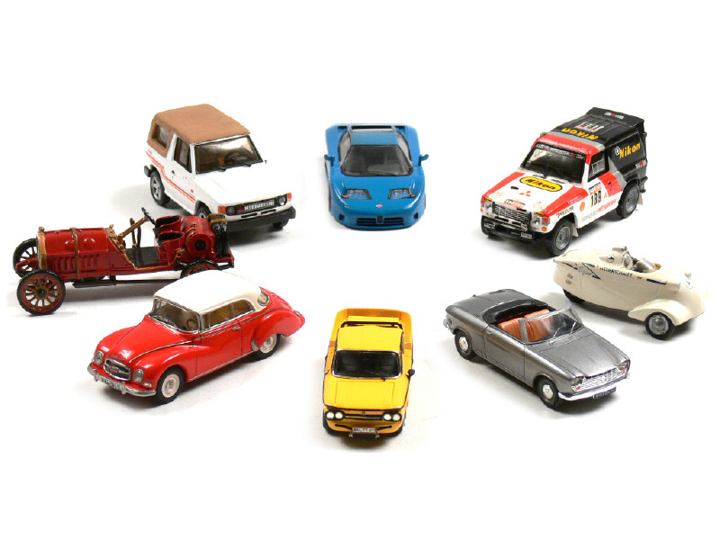miniatures reproduisant les modèles : AUTO-UNION, MITSUBISHI, MESSERSCHMITT, ITALA, NSU, PEUGEOT & BUGATTI - on y retrouve notamment les marques : PROVENCE MOULAGE, MODELL AUTO, JEMMPY, AQUAVIT & JPS - avec manques