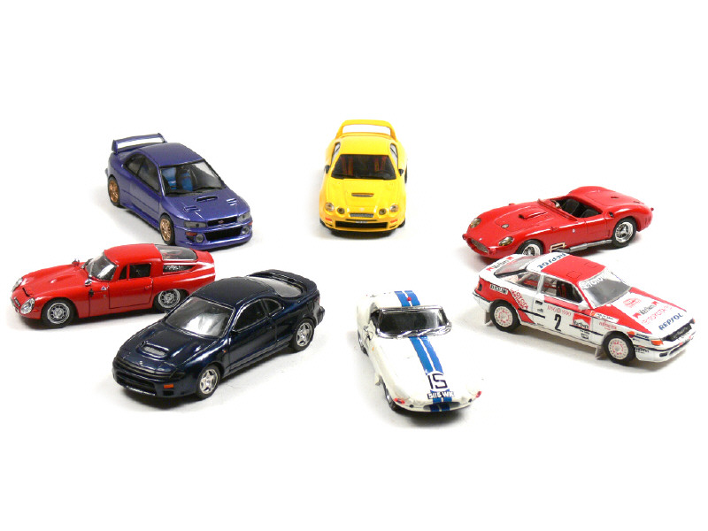 miniatures reproduisant les modèles : TOYOTA, MASERATI (pare-brise incomplet), SUBARU, JAGUAR & ALFA ROMEO (suspension arrière affaissée) - on y retrouve les marques : BEST MODEL, TROFEU & TOP MODEL - éléments ajoutés & non d'origine sur 4 véhicules