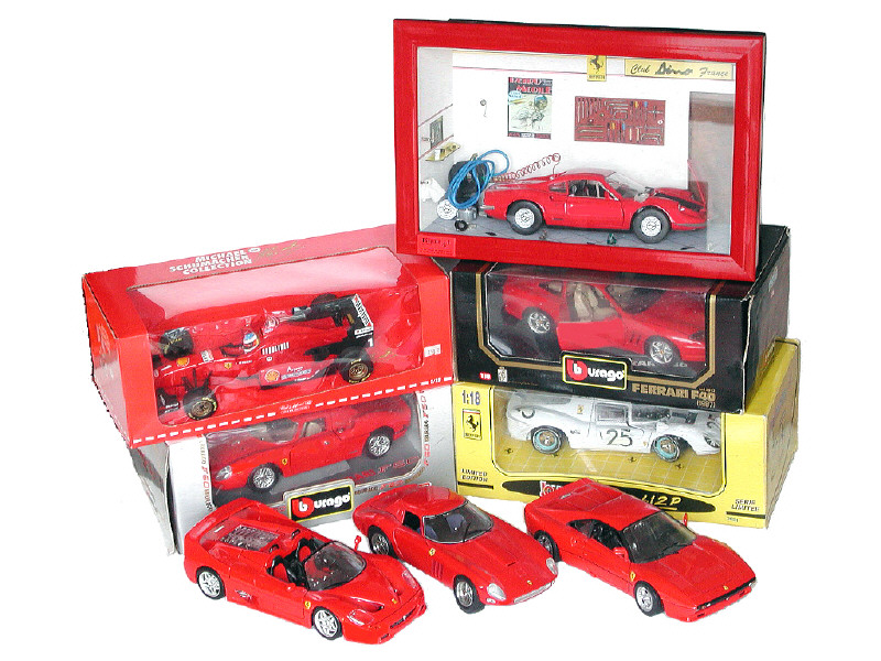 miniatures reproduisant les modèles : 250GTO 1964, F50, 412P, 250LM 1965, 550 MARANELLO, F310, GTO & DINO - on y retrouve les marques : JOUEF EVOLUTION, BBURAGO, PAUL'S MODEL ART & FORMULE 1 - un véhicule état 'C' - détails de peinture ajoutés - présence de 4 boîtes dont une non conforme - une voiture en diorama sous boîte-vitrine