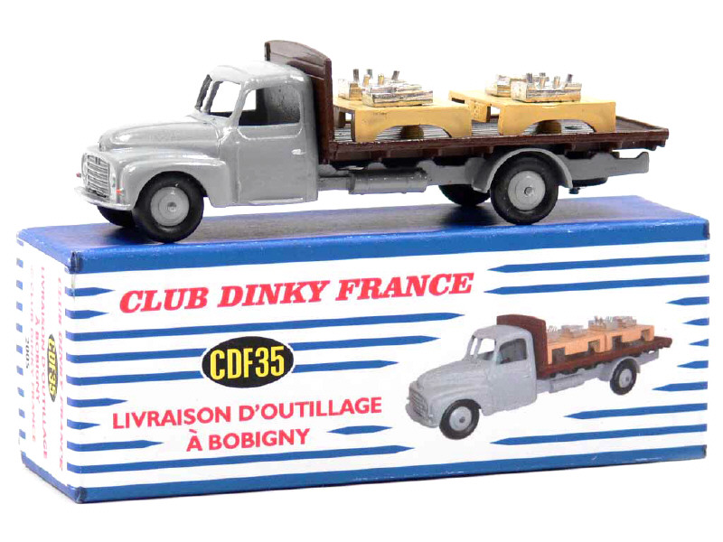 surmoulage modifié de la référence 35A de DINKY TOYS France - ce modèle a été fabriqué pour les membres du club - avec plaque fixée sur le châssis 'CDF 35-2005 LIVRAISON D'OUTILLAGE' & 2 palettes amovibles portant chacune un moule - avec cale de boîte - pneu de secours coupé