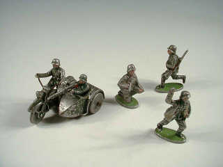 comprend : un side-car avec mitrailleur, un grenadier (manque grenade), un soldat courant & un officier à genoux aux jumelles