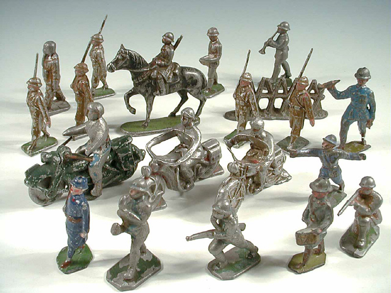 comprend : un cavalier, trois motards, cinq soldats fusil à l'épaule au défilé, un saxophone, une clarinette, un soldat tirant, un soldat à la charge, un brancardier avec masque à gaz, un officier avec carte & une barrière