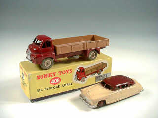 DINKY TOYS (GB) 408 BIG BEDFORD Plateau à ridelles bordeaux & ocre, jantes crème
