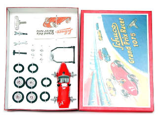 dimensions du coffret : 34,5 x 24,5 cm - contient : une voiture de course GRAND PRIX RACER 1070 (FERRARI) avec roues démontées, outillages, cric, volant, notice, papillons de roues & 4 pneus de rechange - tous les éléments sont sur socle de boîte ficelés, jamais utilisés - fabrication des années 80
