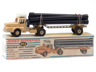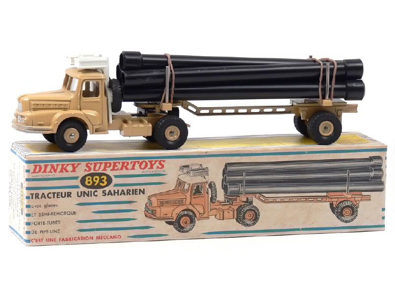 DINKY TOYS (FRANCE) 893 UNIC Saharien transport de pipe-lines (version avec jantes convexes & remorque ajourée) sable & blanc