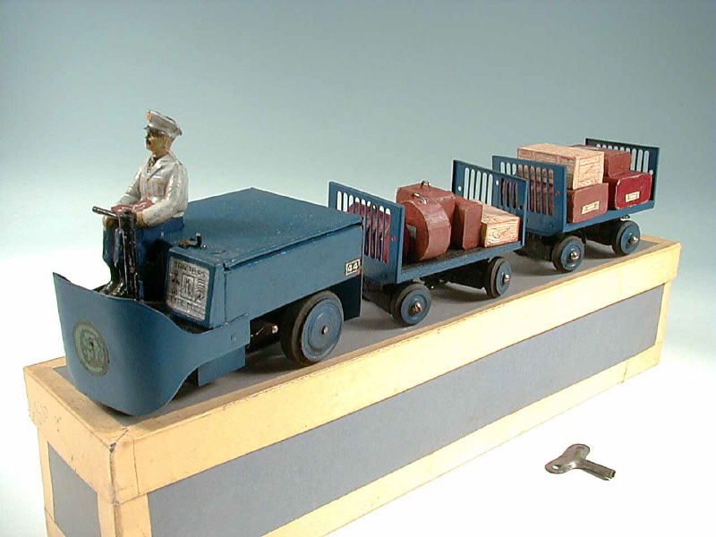 longueur 42 cm - moteur à clef (fonctionne) - fabrication en bois & tôle peinte - personnage en fonte d'aluminium - avec neuf bagages d'origine - ETAT EXCEPTIONNEL !