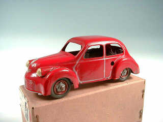 longueur 18 cm - moteur flottant à clef (fonctionne avec sa clef) - direction - notice explicative CIJ sur le fonctionnement du mécanisme sur la RENAULT 4CV - papier de protection d'origine - l'étiquette PF collée sur la boîte représente la marque du distributeur PRESLES Frères, 6, Rue Sedaine à PARIS XIème - une pastille rouge indique la couleur du jouet