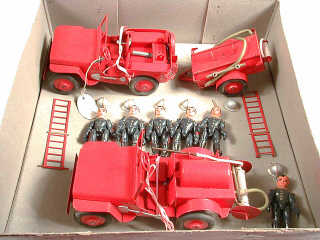 dimensions 33 x 33 cm - comprend : une JEEP citerne en tôle avec dévidoir (avec sa clef), une JEEP avec double échelle, une remorque citerne à 2 roues & six pompiers articulés avec casques amovibles - l'ensemble n'a jamais été déballé - EXCEPTIONNEL !