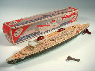 MIC (FRANCE) Paquebot en tôle lithographiée crème, noir & turquoise