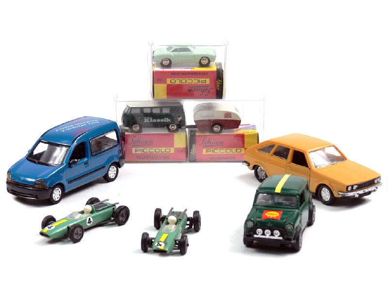 miniatures reproduisant les modèles : LOTUS (un exemplaire avec un décalque incomplet), MINI (un autocollant incomplet), RENAULT (dont un modèle promotionnel) & VOLKSWAGEN - on y retrouve les marques : DINKY TOYS HOLLANDE, NACORAL, NOREV, SCHUCO PICCOLO (en boîtes 'a') & SOLIDO