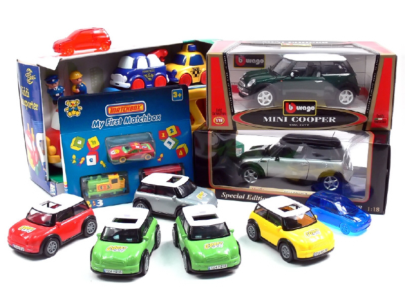 miniatures reproduisant notamment les modèles : MINI, FERRARI & VOLKSWAGEN (2 modèles promotionnels) - on y retrouve notamment les marques : BBURAGO, MAISTO, FIZZY CREATION, MATCHBOX & GOLDEN BELL - 8 véhicules en boîte