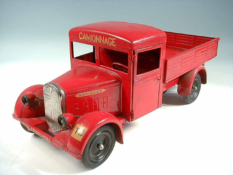 longueur 42 cm - version luxe avec phares électriques - moteur mécanique à clef (fonctionne) - mentions 'CAMIONNAGE' sur le fronton de la cabine, 'RENAULT' de part et d'autre du capot & 'TD' sur l'aile avant gauche - SUPERBE !