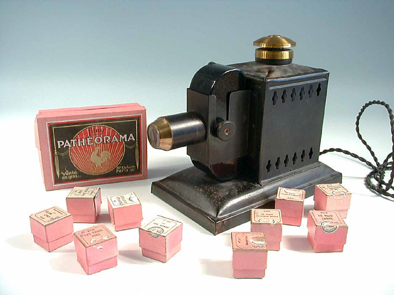 dimensions 22 x 20 x 25 - éclairage par lampe à incandescence - système PATHEORAMA avec chargeur de films à vue fixe - on y joint 10 films dans leur boîtier individuel carton, ainsi qu'une boîte complète de 12 films