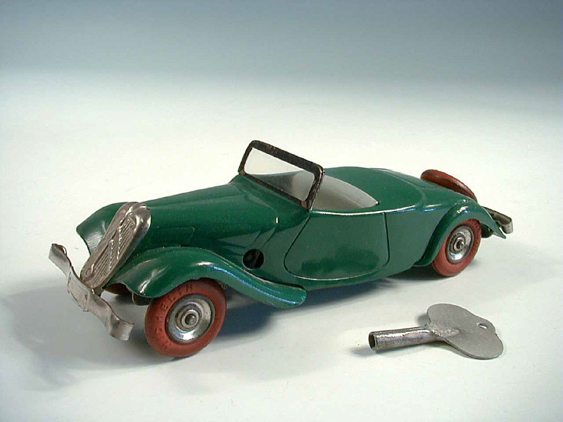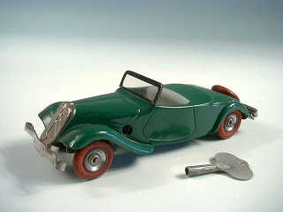 fabriqué en 1935 - longueur 17 cm - moteur à clef avec traction avant (fonctionne) - version avec jantes en tôle & pneus en caoutchouc 'MICHELIN' - ETAT EXCEPTIONNEL !