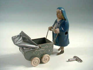 hauteur 14 cm - mécanisme à clef (fonctionne) - la nurse est en composition & le landau en tôle & plastique, roues bois