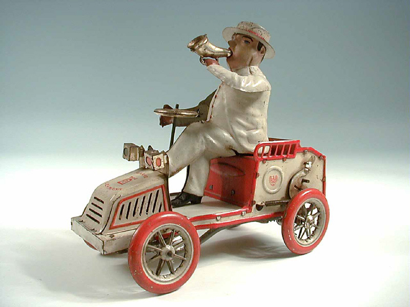 longueur 17 cm - fabriqué de 1903 à 1935 - moteur à ressort (fonctionne) - clef restaurée - en action, le véhicule avance & le conducteur change de direction - le cornet fonctionne grâce à un soufflet en papier huilé (petit trou) - SUPERBE !