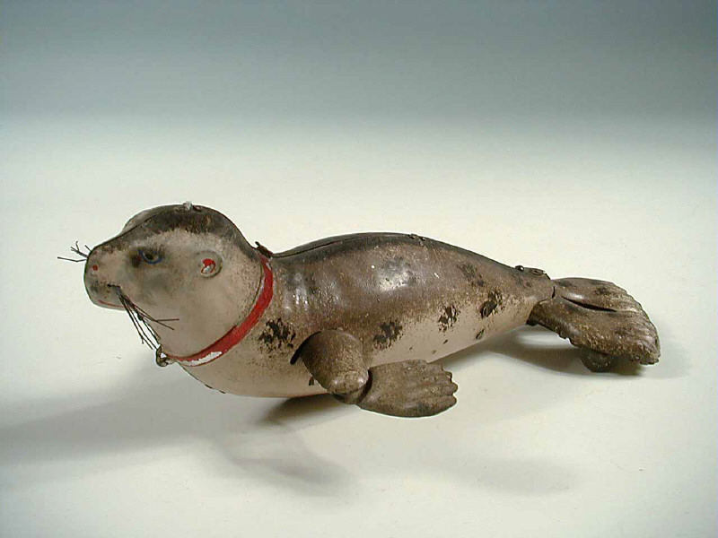 longueur 19 cm - fabriqué de 1899 à 1935 - mécanisme à clef (fonctionne) - en action, l'animal rampe en battant des nageoires avant - moustaches d'origine