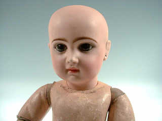 circa 1880 - tête en biscuit moulé marquée au tampon rouge 'Déposé Tête Jumeau Bté S.G.D.G.' - taille 8, hauteur 47 cm - fêle à la tempe droite - yeux fixes bruns, bouche fermée, oreilles percées (petit éclat sur l'oreille gauche) - corps articulé en composition avec étiquette bleue 'Bébé Jumeau, Diplôme d'Honneur' - poignets fixes - accidents aux doigts