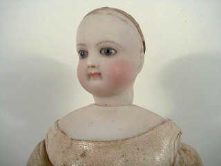 tête pivotante et collerette en biscuit - yeux fixes bleus, bouche fermée & corps en peau raide - articulations à goussets aux hanches - doigts cousus séparément (accidents) - hauteur 30 cm