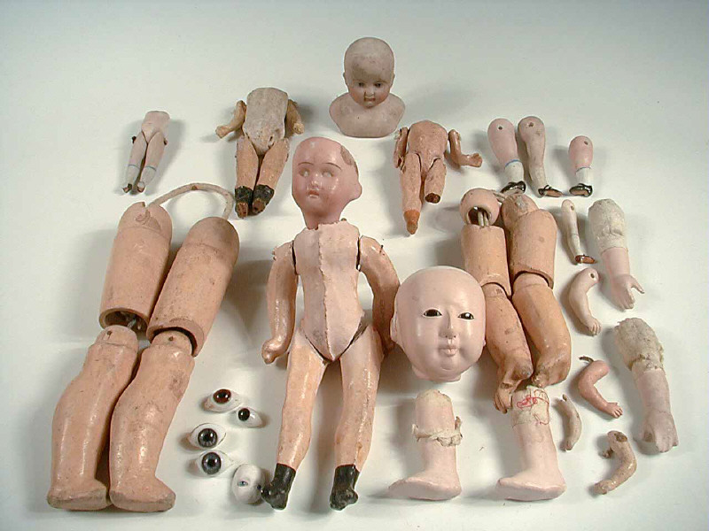 composé de jambes et bras en composition, tête de poupée japonaise en composition (accidents), tête-buste en biscuit (pleine) avec yeux pleins & bouche fermée, petite poupée tête porcelaine (hauteur 20 cm), yeux en verre, etc...