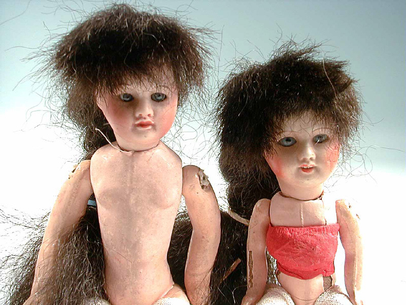 circa 1910 - yeux fixes bleus, bouche ouverte sur une rangée de dents, perruque brune & corps raide en composition - hauteur 21 cm - on y joint une petite valise & des vêtements