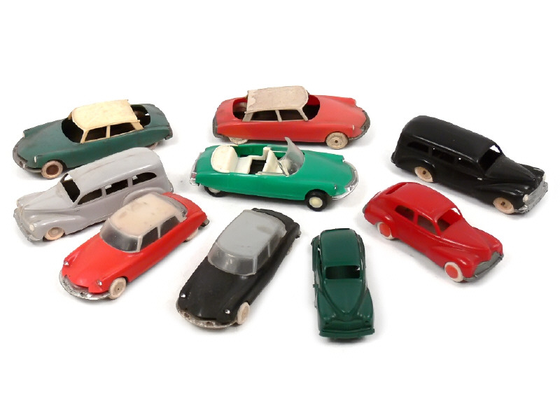 états de 'B' à 'D' - comprend : CITROEN DS 19 (4 exemplaires différents), CITROEN DS 19 cabriolet, PEUGEOT 203 berline (2 exemplaires différents) & PEUGEOT 203 commerciale (2 exemplaires différents) - on y retrouve les marques : MINIALUXE, CLE & BS - un véhicule avec moteur à friction (fonctionne) - quelques carrosseries déformées & poussiéreuses - traces d'oxydation sur plusieurs axes de roues