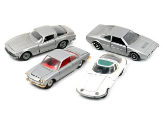 comprend : CORVAIR BERTONE, FIAT SIATA 1500, ISO GRIFO & FERRARI DINO GT4 (de la marque POLISTIL) - carrosseries légèrement poussiéreuses - pellicule chromée de 2 pare-chocs en grande partie effacée