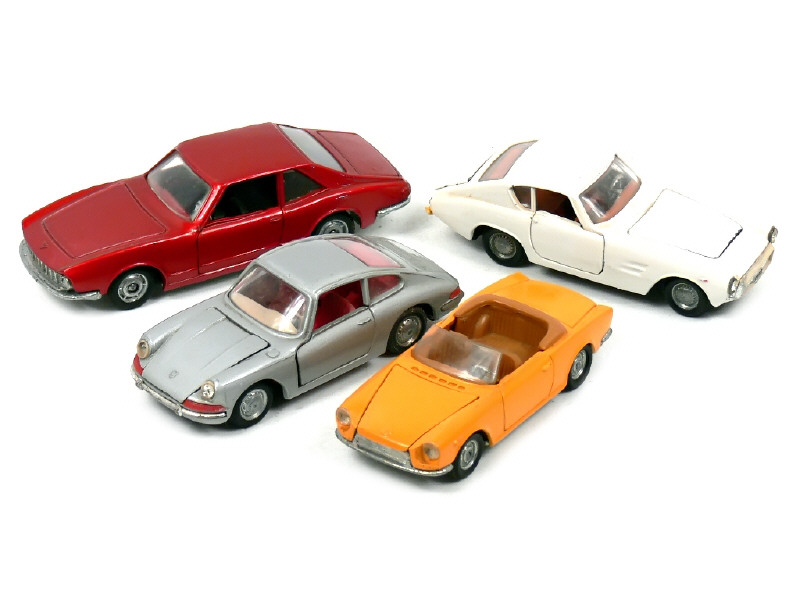 états de 'B' à 'C' - comprend : PORSCHE 912, FIAT 124 cabriolet, GHIA V.280 & FIAT 1500 GT GHIA - pellicule chromée de certains modèles en grande partie effacée - manque un phare scintillant sur une voiture - carrosseries poussiéreuses