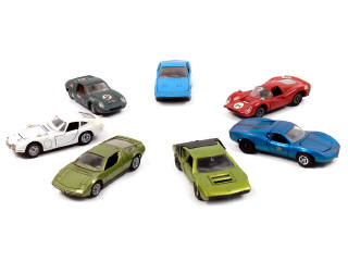 états de 'B' à 'C' - miniatures reproduisant les modèles : LAMBORGHINI, FERRARI, LOTUS, TOYOTA & CHEVROLET - on y retrouve les marques MEBETOYS & POLITOYS - quelques carrosseries encrassées