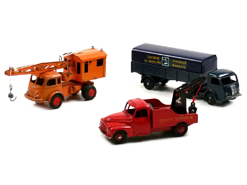 états de 'D' à 'E' - miniatures reproduisant les modèles : CITROËN (nombreuses retouches avec ficelle non d'origine), PANHARD (bâche non d'origine) & RENAULT (ficelle & crochet non d'origine) - on y retrouve les marques DINKY TOYS & C.I.J.