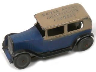 modèle en plomb, avec plancher en tôle - promotionnel réalisé pour le salon de l'auto 1931 avec le slogan 'ROUES AVANT INDEPENDANTES PEUGEOT' en relief sur le toit - manque phares, une partie arrière de la carrosserie & d'aile