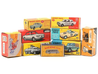 comprend : DINKY TOYS GB (136 & 155), CORGI TOYS (318 & 438), SOLIDO (57/57 bis & 200), MINI BUBY (10), MATCHBOX (40) & MINIALUXE (KART ROUGE)