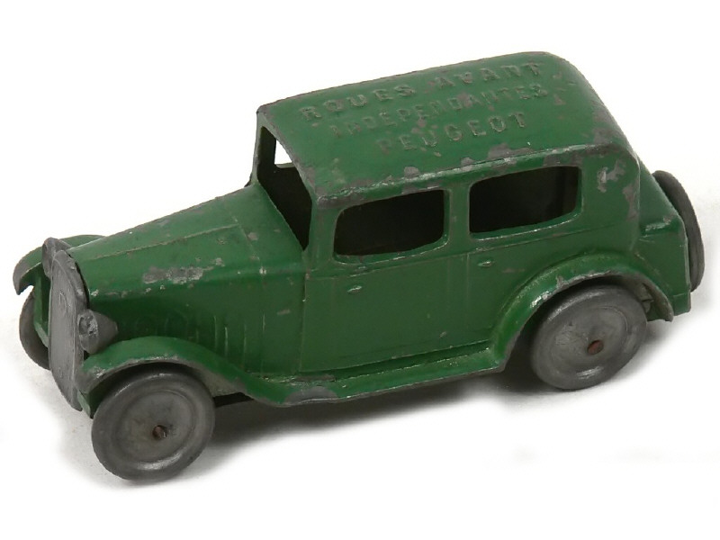 modèle en plomb avec plancher en tôle - promotionnel réalisé pour le salon de l'automobile 1931 avec le slogan 'ROUES AVANT INDEPENDANTES PEUGEOT', en relief sur le toit - axes de roues oxydés - un défaut de moulage sur le côté droit