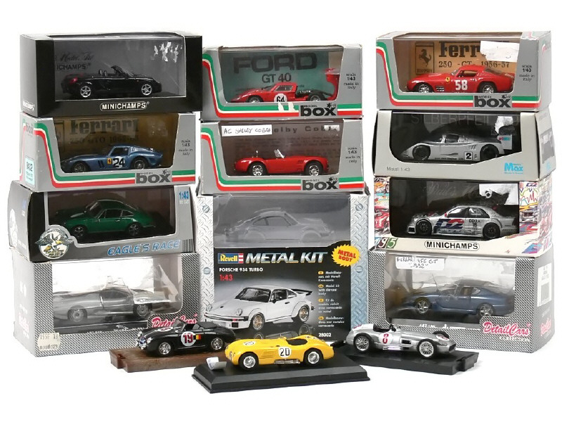 miniatures reproduisant les modèles : PORSCHE, FERRARI, MERCEDES, TOYOTA, JAGUAR, FORD & AC COBRA - on y retrouve les marques : REVELL, DETAILCARS, UNIVERSAL HOBBIES, MODEL BOX, MODELS MAX, MINICHAMPS, BRUMM & TOP MODEL - on y joint un diorama en carton de la marque ART MODEL - possibilité de petits manques
