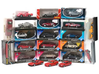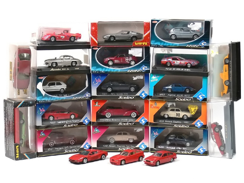 miniatures reproduisant les modèles : ALPINE RENAULT, ALFA ROMEO, MASERATI, MERCEDES, FERRARI, RENAULT, VOLSKWAGEN, PEUGEOT, LAMBORGHINI & PORSCHE - on y retrouve les marques : SOLIDO, VEREM, BBURAGO, NZG, ALEZAN, TRON KITS, SOUPAPES (kit pré-peint à monter) - possibilité de petits manques