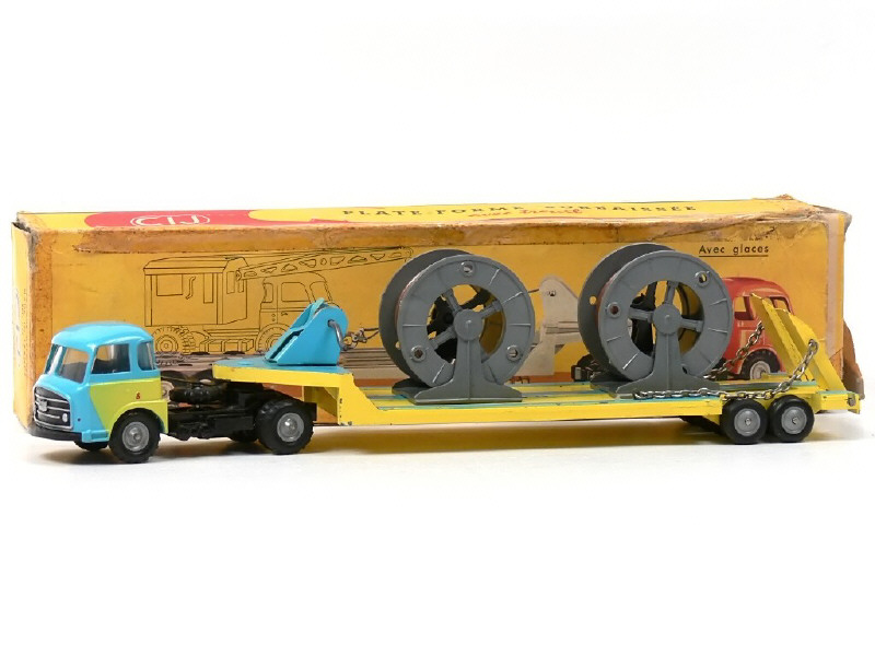 C.I.J. (FRANCE) 4/75 SAVIEM LRS Semi-remorque surbaissée porte-bobines de câble bleu & jaune vert