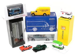 comprend : MERCEDES-BENZ véhicule d'écurie 'MARTINI PORSCHE RACING', RENAULT FREGATE (un cabriolet, une berline & un break regroupées dans un coffret), MERCEDES-BENZ O321H 'AACHENER STRASSENBAHN', MERCEDES-BENZ L319 véhicule d'exposition 'ZUNDAPP BELLA', ALFA ROMEO 500 fourgon 'SCUDERIA FERRARI', CITROEN H 'YOPLAIT', DODGE POWER WAGON pick-up, CHEVROLET BLAZER & MERCEDES-BENZ L408 'AMBULANCE' - on y retrouve les marques : PREMIUM CLASSIXXS, MINICHAMPS, ELIGOR, EXOTO 48 & MATCHBOX