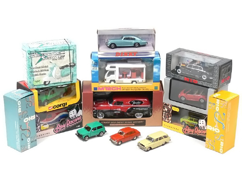 miniatures reproduisant notamment les modèles : BENTLEY, DUESENBERG, HISPANO-SUIZA, MERCEDES, CADILLAC, BUGATTI, DELAHAYE, ROUTEMASTER, VOLKSWAGEN, LADA, RENAULT, FERRARI, TALBOT-MATRA, HILLMAN, FORD, TOYOTA, AUSTIN, CHEVROLET, MAN, ISUZU & LAMBRETTA - on y retrouve les marques : DINKY MATCHBOX, RIO, LLEDO, REXTOYS, CORGI TOYS, VANGUARDS, WELLY, SOLIDO, JOUEF EVOLUTION, MTECH, FENDER, SPEC-CAST, LONE STAR, DEL PRADO & XONEX - 2 modèles regroupés dans un coffret