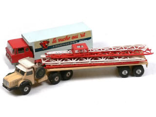 avec derrick (quelques petites parties cassées & une plate-forme manquante) - carrosserie encrassée - côté gauche du support de treuil du tracteur en partie brûlé - manque ranchers de remorque