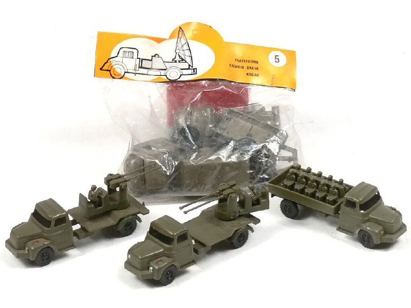 contient : MERCEDES bâché, MERCEDES radar & une semi-remorque surbaissée - réalisation en plastique à monter sous sachet jamais ouvert - 2 axes de roues cassés - on y joint 3 camions BERLIET (un transport de troupes & 2 canons anti-aérien dont un avec parties recollées) de la marque CLE