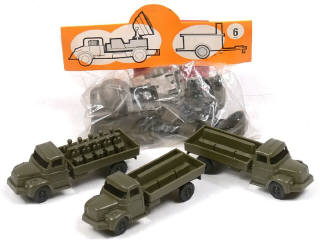 contient : MERCEDES transport de troupe (avec 8 soldats), MERCEDES projecteur anti-aérien & cuisine roulante - réalisation en plastique à monter sous sachet jamais ouvert - on y joint 3 camions BERLIET transports de troupes de la marque CLE (un modèle avec soldats)