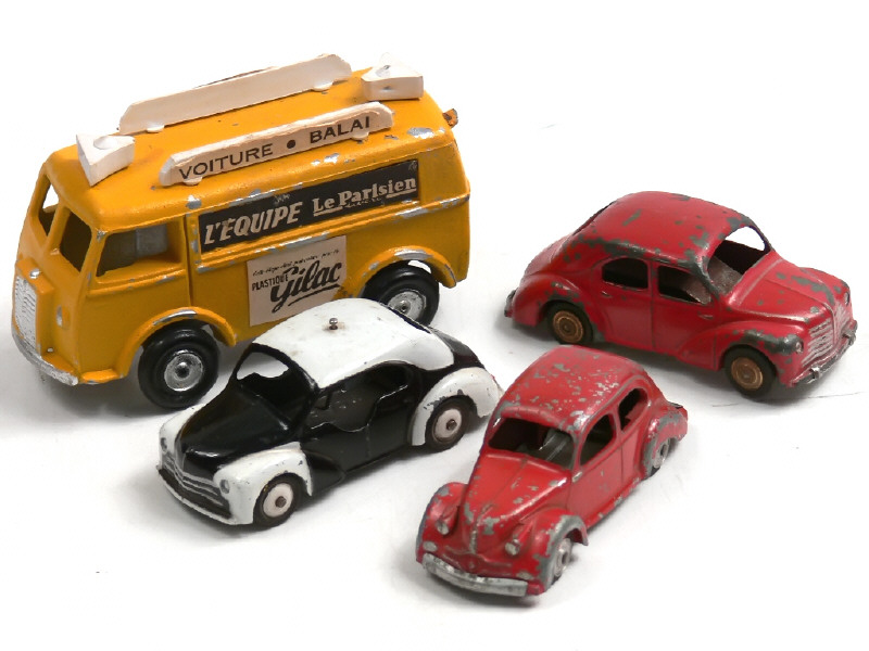 états de 'D' à 'E' - miniatures reproduisant les modèles RENAULT(un modèle avec décalques manquants) & PANHARD (version avec moteur à clef) - on y joint un PEUGEOT D4A de la marque SALZA avec balai & un autocollant manquants