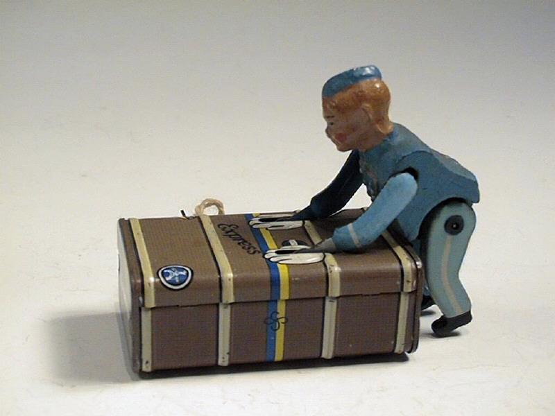 GESCHA (ALLEMAGNE) Groom poussant une malle bleu ciel & ocre