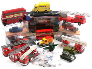 états de 'A' à 'E' - miniatures reproduisant notamment les modèles : MERCEDES, BERLIET, AMX, FORD, ROUTEMASTER, CITROEN & RENAULT - on y retrouve notamment les marques : DINKY TOYS, MATCHBOX, SOLIDO, CORGI TOYS, SIKU, NOREV, VITESSE, BRITAINS & LLEDO - 8 modèles avec boîte dont une non d'origine - on y joint un ensemble de figurines en métal peint - avec manques