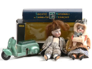 hauteur 9,5 cm - réalisation en porcelaine - un petit manque sur un pied - on y joint une bâche de PANHARD 'SNCF' DINKY TOYS, un scooter incomplet (pneus affaissés) & une boîte vide SOLIDO (référence 1055)
