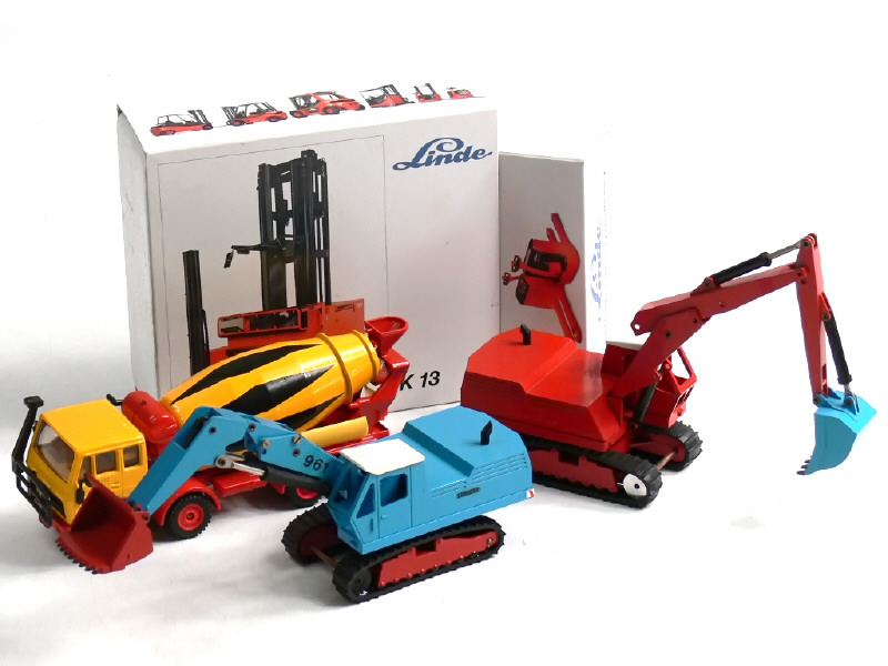 états de 'A' à 'C' - miniatures reproduisant les modèles : LIEBHERR (un véhicule avec décalques manquants & un autre avec galets de chenilles fondus), MERCEDES & LINDE (en boîte état 'b') - on y retrouve les marques : CONRAD, SIKU & STRENCO